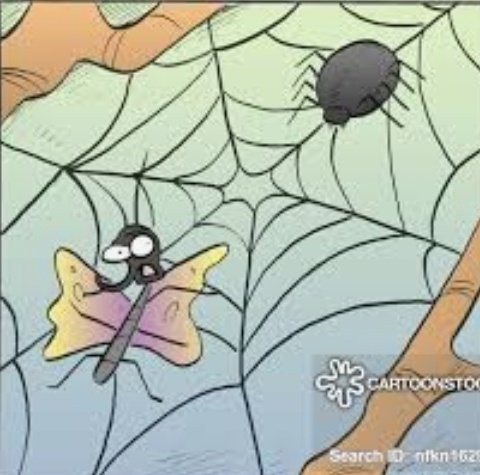 சிலந்தி: (கோபத்துடன்) நீ என்ன மனிதனைப்போல பேசுகிறாய் ? நான் என்ன மனிதனா, வலைவிரித்து, துணை தேடிப் பிடிக்க?