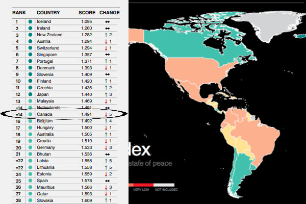 2025 ஆண்டிற்கான உலகின் அமைதியான நாடுகள் பட்டியல் வெளியாகியுள்ளதுடன், கனடா 14 ஆவது இடத்தை பெற்றுள்ளது. கடந்தாண்டு 1.449 புள்ளிகளுடன் 11ஆவது இடத்தில் இருந்த நிலையில், இந்தாண்டு 1.491புள்ளிகளை பெற்று 14 ஆவது இடத்தை பெற்றுள்ளது.