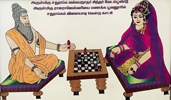 அரசருக்கு தனது அறிவிப்பு நினைவில் வந்தது. "இப்படி வயதில் முதிர்ந்த ஒருவருக்கு தன் இளம் மகளை எப்படித் திருமணம் செய்து கொடுப்பது?" என்று பெருங்கவலை ஏற்பட்டது. மீண்டும் அவர் சிவனாரைத் தியானிக்க, அங்கே முதியவர் மறைந்து சாட்சாத் சிவபெருமானே தோன்றினார். சதுரங்க ஆட்டத்தில் வென்று, ராஜராஜேஸ்வரியை மணந்ததால், அவருக்குச் ‘சதுரங்க வல்லபநாதர்’ என்ற திருப்பெயர் ஏற்பட்டது. அன்னை ராஜ ராஜேஸ்வரிக்கும் வளர்ப்புத் தாயாக வந்த சாமுண்டீஸ்வரிக்கும் தனித் தனிச் சந்நிதிகள் உள்ளன. இங்கு வந்து சதுரங்க வல்லப நாதரை வேண்டிக்கொண்டால் சதுரங்க விளையாட்டில் நல்ல தேர்ச்சி கிடைக்கும் என்பது நம்பிக்கை.
