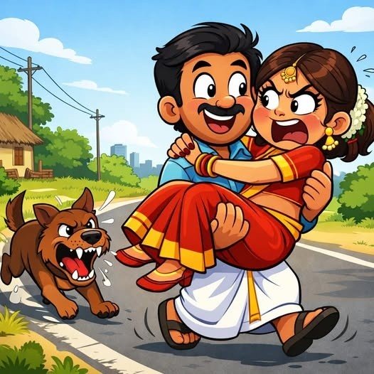 புதியதாக திருமணம் ஆன தம்பதியர் சாலையோரத்தில் நடந்து கொண்டிருந்தனர். அப்போது எங்கிருந்தோ திடீரென ஒரு நாய் குரைத்துக்கொண்டு ஓடி வந்தது.