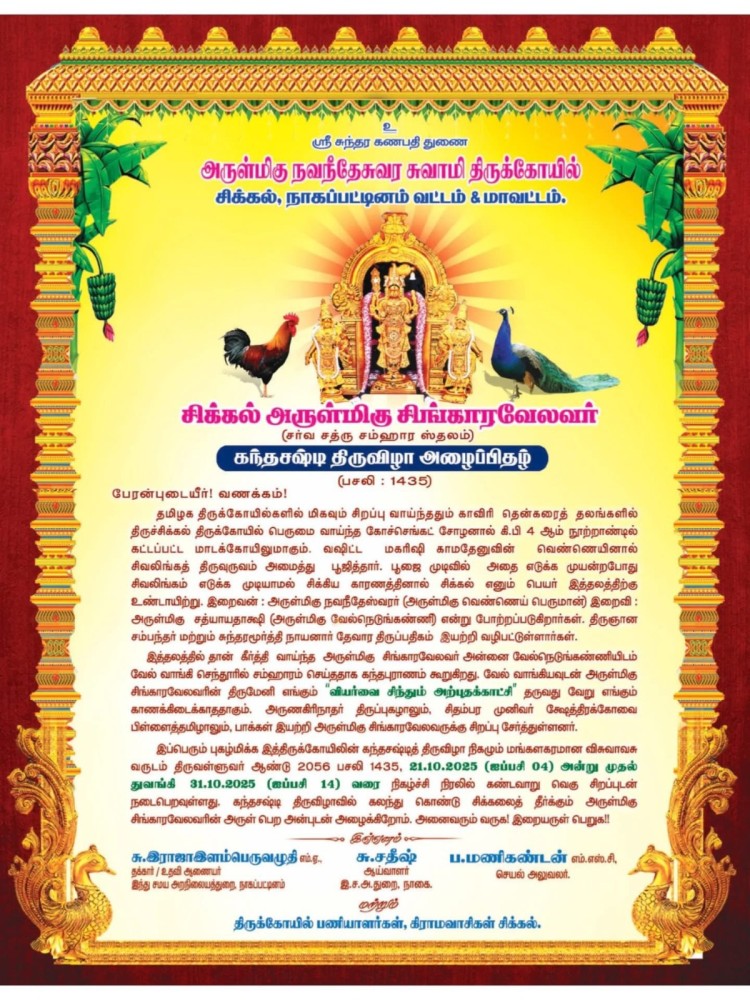 தமிழ்நாட்டில் - சிக்கல், அருள்மிகு சிங்காரவேலர் திருமுகத்தில் வியர்வை சிந்தும் அற்புதம்- சூரசம்காரத்திற்கு சக்திவேல் வாங்கும் கந்தஷஷ்டி திருவிழா 2025