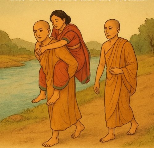 அதற்கு அந்த துறவி அமைதியாகச் சிரித்து, “நான் அந்த பெண்ணை ஆற்றின் கரையிலேயே இறக்கி விட்டேன்.ஆனால் நீ இன்னும் அவளை உன் மனதில் சுமந்து கொண்டு செல்கிறாய். நீயும் கீழே இறக்கி விடு,” என்றார்.
