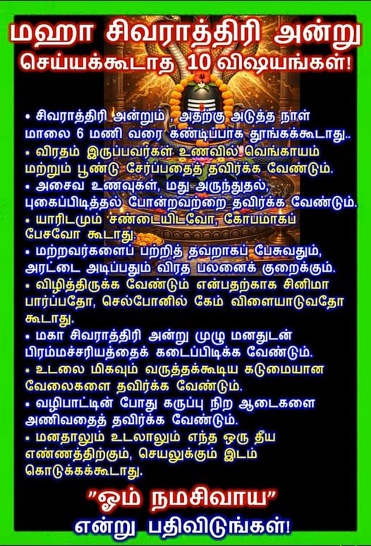 ஜென்ம ஜென்மமாய் நாம் தேடிய பேரின்பம் மகா சிவராத்திரியின் இந்த புனித நாளில் பூரணமாகட்டும் சிவனின் கருணைக்கடல் நம் பாவங்களைச் சுட்டெரித்து நம்மை பரிசுத்தமாக்கட்டும் ஓம் நமசிவாய மந்திரத்தின் சக்தி நம் ஆன்மாவின் ஆழங்களில் ஒளிர்ந்து அமைதியான புதிய பாதையை காட்டட்டும் அனைவருக்கும் இதயம் கனிந்த மகா சிவராத்திரி நல்வாழ்த்துகள்!