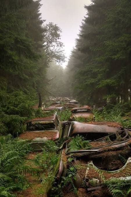 பெல்ஜியம் நாட்டின் சாட்டிலான் என்ற இடத்தில் இருக்கும் வனாந்திரத்தில்தான் இந்த கார்கள் நிறுத்தப்பட்டிருக்கின்றன. அந்த கார்கள் மழையிலும், வெயிலிலும் சிதைந்து எலும்பு கூடு போல் காட்சியளிக்கின்றன.