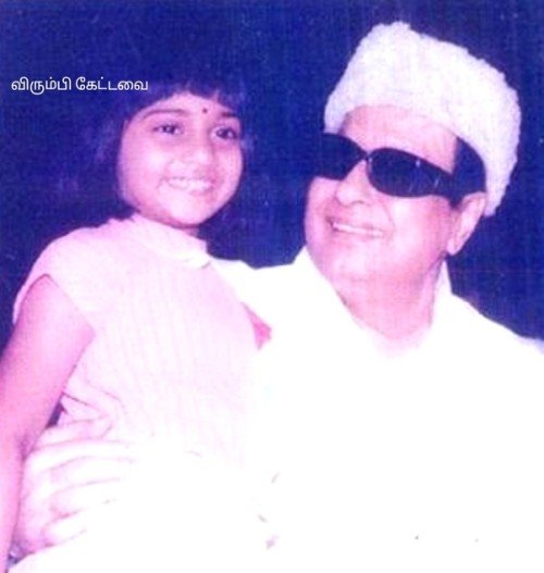 “இந்த படம் கே.ஆர்.விஜயாம்மாவின் தங்கை கல்யாணத்தப்ப எடுத்தது. அரசியல்வாதிகளும் சினிமா ஆட்களும் எம்.ஜி.ஆரிடம் நெருங்கவே தயங்கிய நேரம். நான் நேராகப் போய் அவர் கழுத்தில் ஒரு சந்தன மாலையைப் போட்டேன். என்னை இழுத்து அணைச்சு என் கன்னத்தில் ஒரு முத்தம் கொடுத்தார் எம்.ஜி.ஆர். ரொம்ப நைஸா அவர்கிட்ட ‘உங்க பேர் என்ன?’னு கேட்டேன். சிரிச்சிக்கிட்டே “எம்.ஜி.ஆர்”னு சொன்னார். “அதுதான் தெரியுமே. அப்படின்னா என்ன அர்த்தம்?”னு மறுபடி கேட்டேன். இன்னும் பலமா சிரிச்சார். பிறகு எம்.ஜி.ராமச்சந்திரன்னு அழுத்தமாச் சொன்னார்.