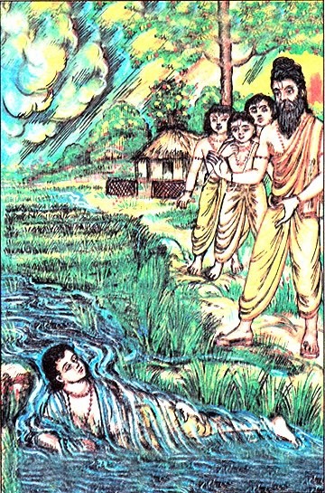 வேகமாக வீசிய காற்றுடன் ஆசிரமத்திற்கு விரைந்தார், விறகுகளை கீழே இறக்கி, தீவிர நம்பிக்கையுடன். அவர் முனிவரிடம் கூறினார், பின்னர் வேகமாக ஓடினார், "தங்க முடியாத வெள்ளத்தை எதிர்த்துப் போராடுங்கள்".