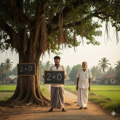 வாத்தியார் சிரித்துக்கொண்டே, "நீ அங்கேயே நிக்க வேண்டியதில்லை தம்பி. நீ முதல்ல போட்ட கணக்கு, 'ரெண்டுப் பேர் சும்மா நின்னா' என்ன ஆகும்? ஒன்றுமில்லை! அதுதான் விடை. நீ அந்தப் பதிலைப் பார்த்து கோபப்படாம, அந்தப் போர்டுக்குப் பின்னாலயும் ஒரு கணக்கு எழுதியிருக்கேனே, அதைப் பார்க்கலையா?" என்று கேட்டார்.